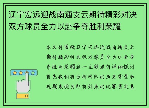 本文将围绕“辽宁宏远迎战南通支云期待精彩对决,双方球员全力以赴争夺胜利荣耀”这一主题进行详细探讨。首先,我们将分析两队的历史背景和近期表现,为即将到来的比赛奠定基础;其次,着重关注双方主要球员的状态与表现,剖析他们在本场比赛中的关键作用;接着,从战术打法的角度出发,讨论教练在本场比赛中的策略安排;最...